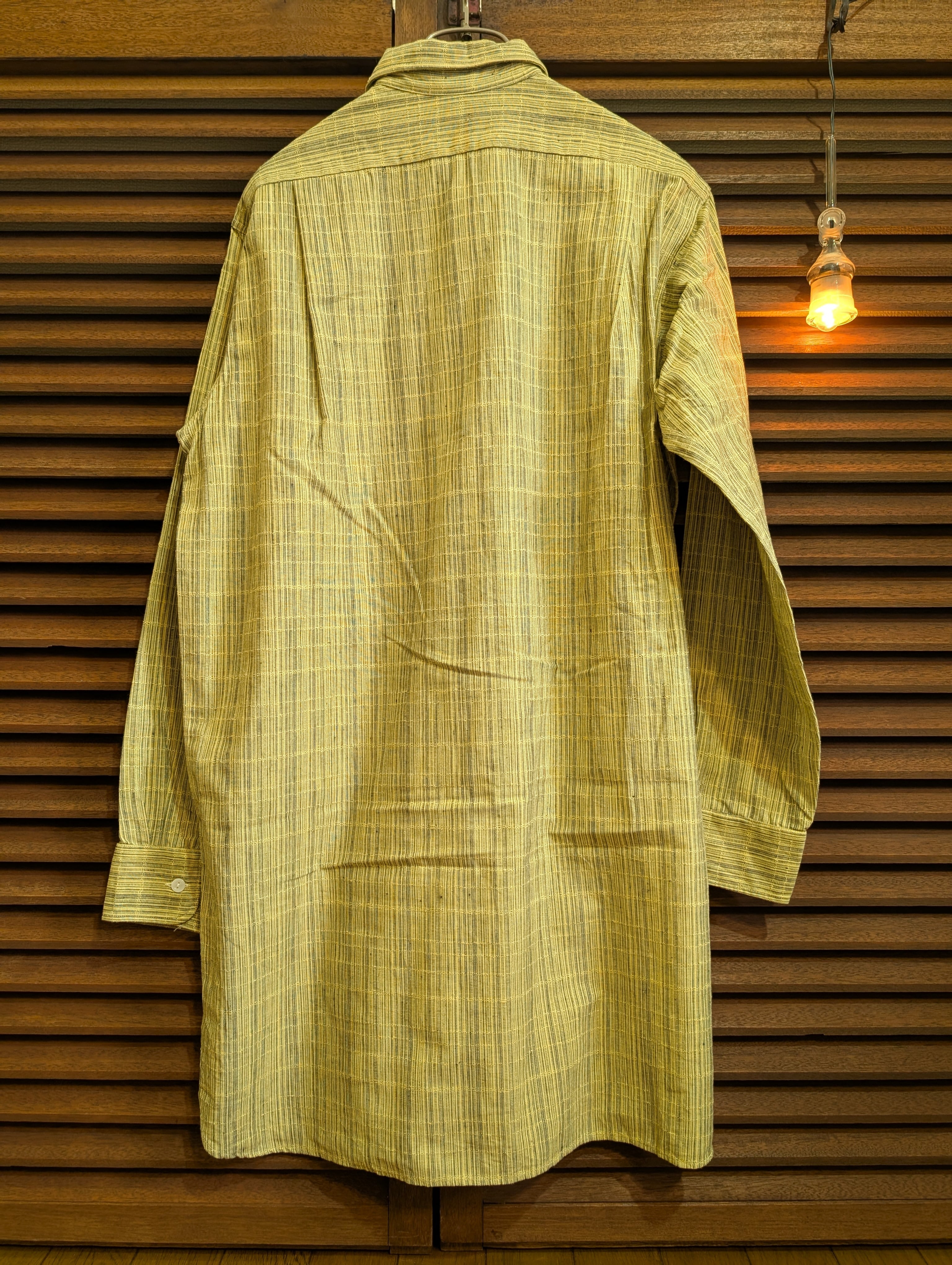 こちらは、イエローグリーンベースにグリーン・ブラックの細かい織柄となっております。織柄もなかなか見ないもので、デザイン的にも目を引く一着となっています。コットン素材でさらっと着れ、これぞユーロヴィンテージの雰囲気を出してくれます。