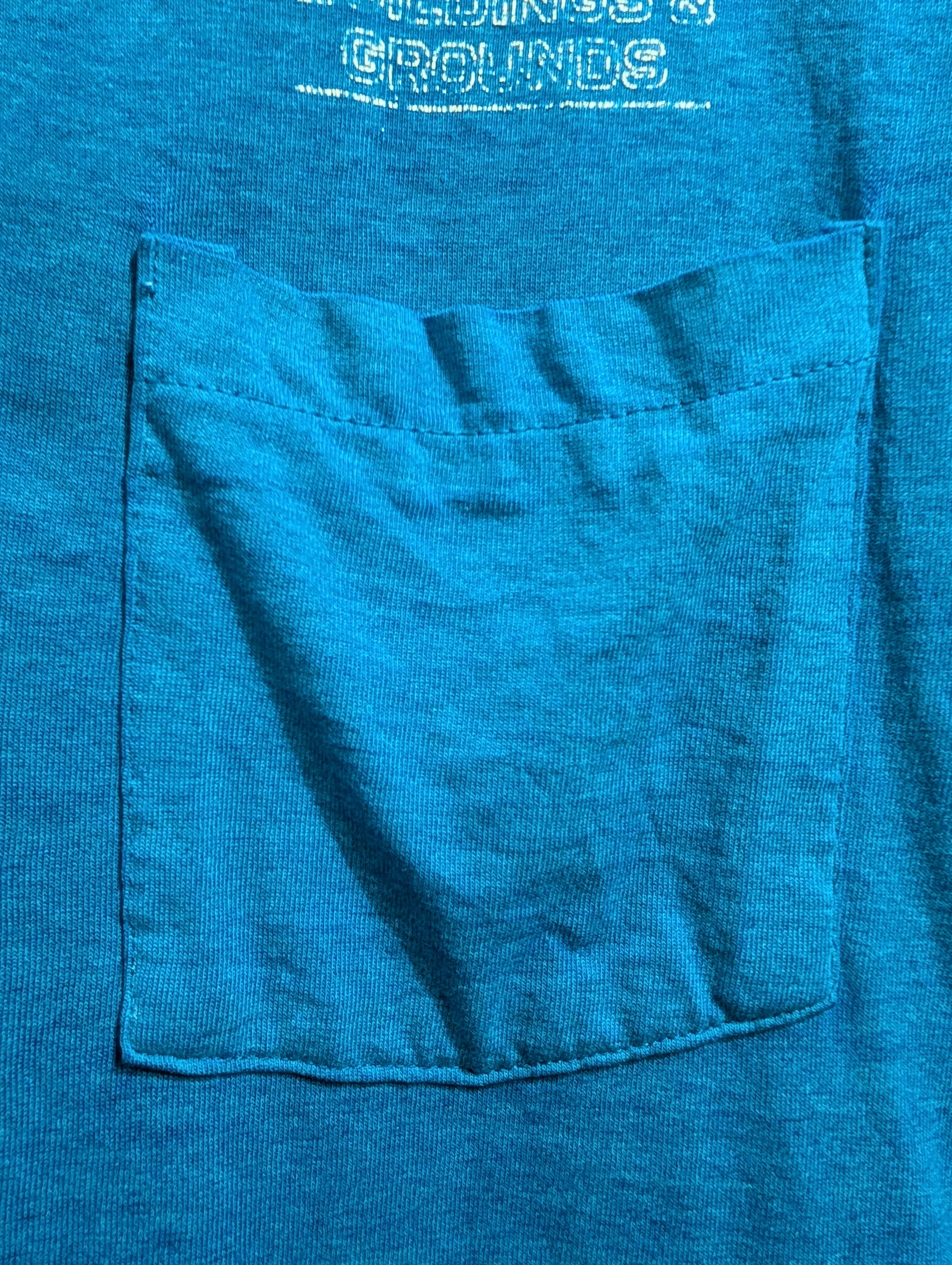 カラーはブルーで、フロントには胸にワンポイントプリントがあります。