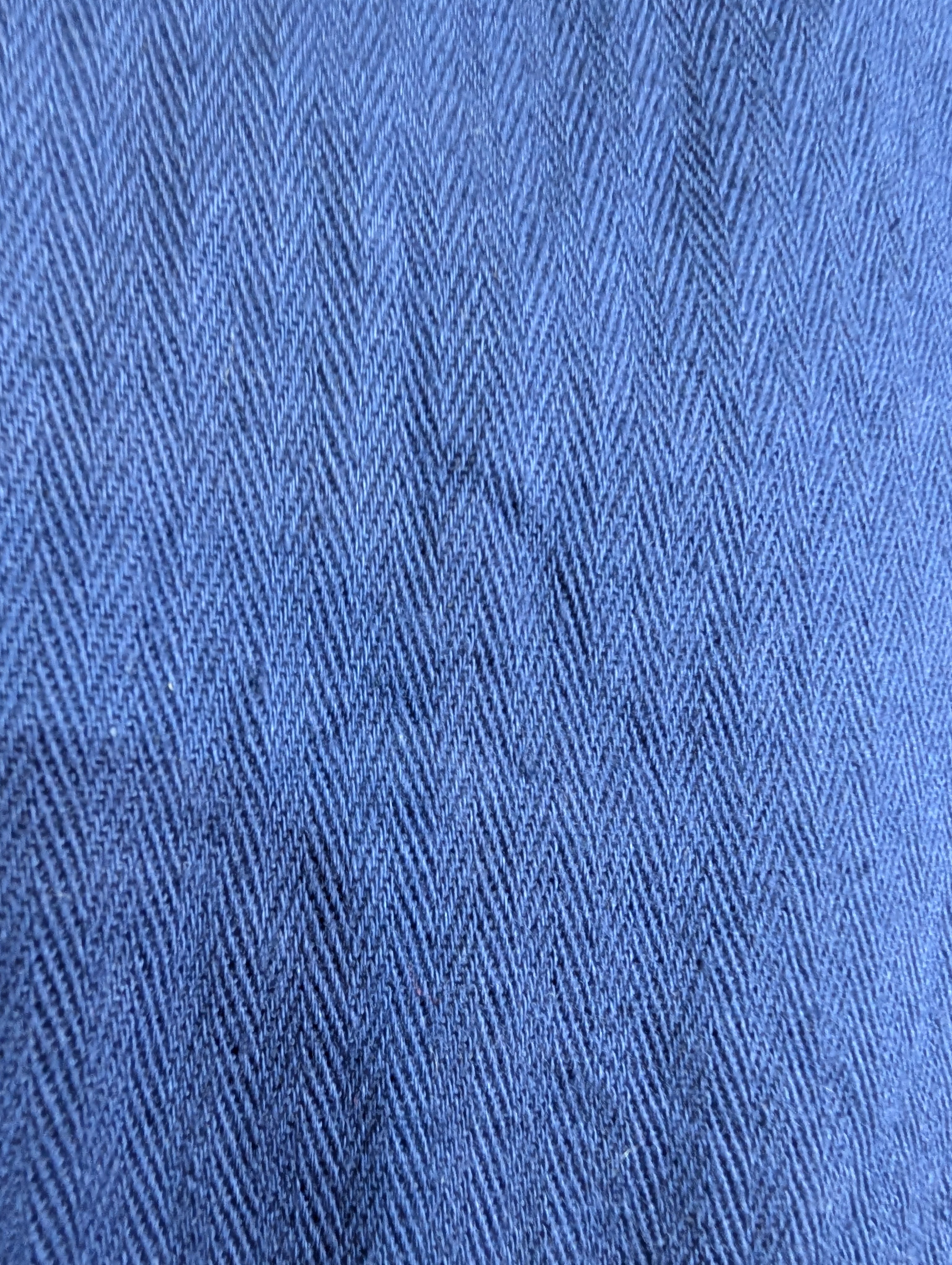 カラーはネイビーで、耐久性にも優れたヘリンボーンコットン生地となっており、生地感や織柄が特徴的なアイテムです。生地としては薄手の生地感で、コットン素材のため通気性もよく、シャツジャケットのような感覚で着用していただけます。
