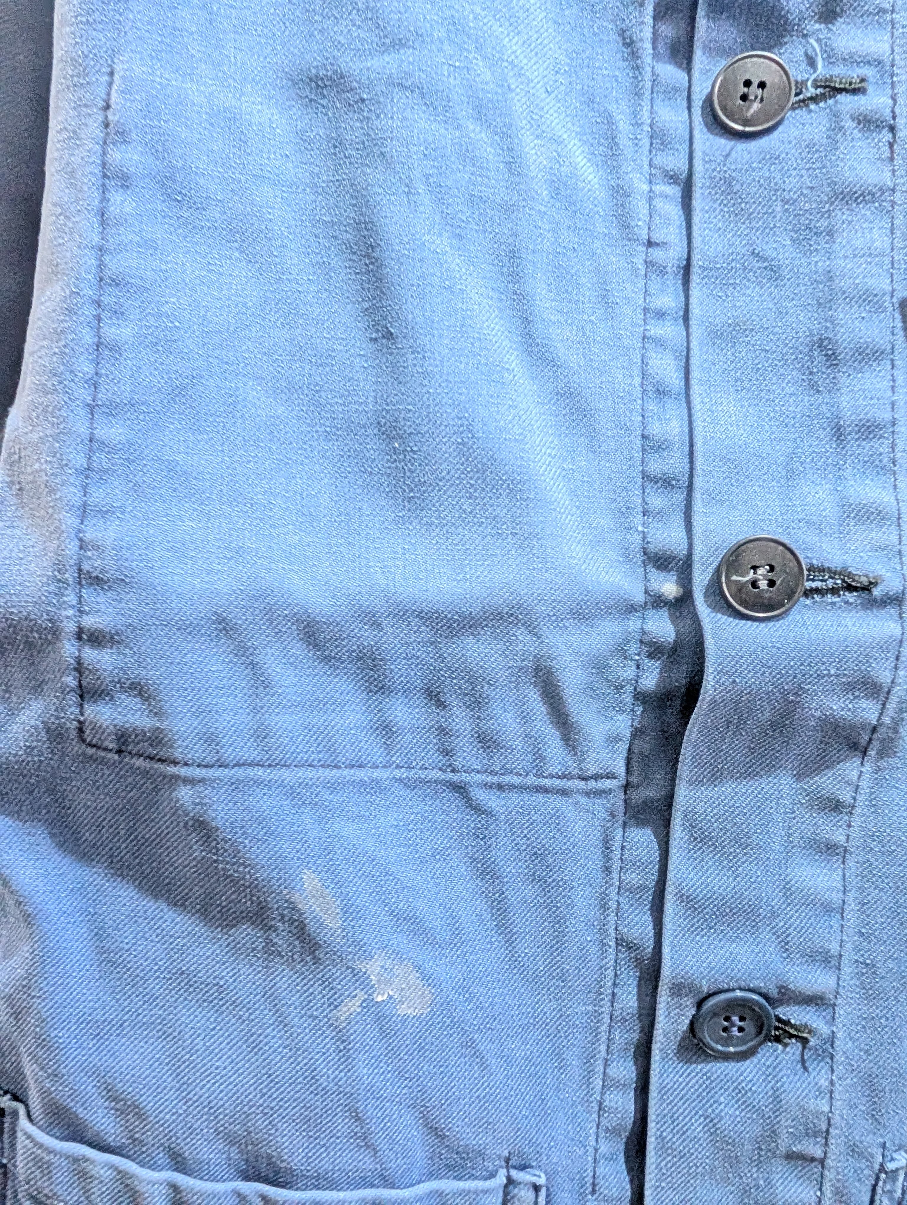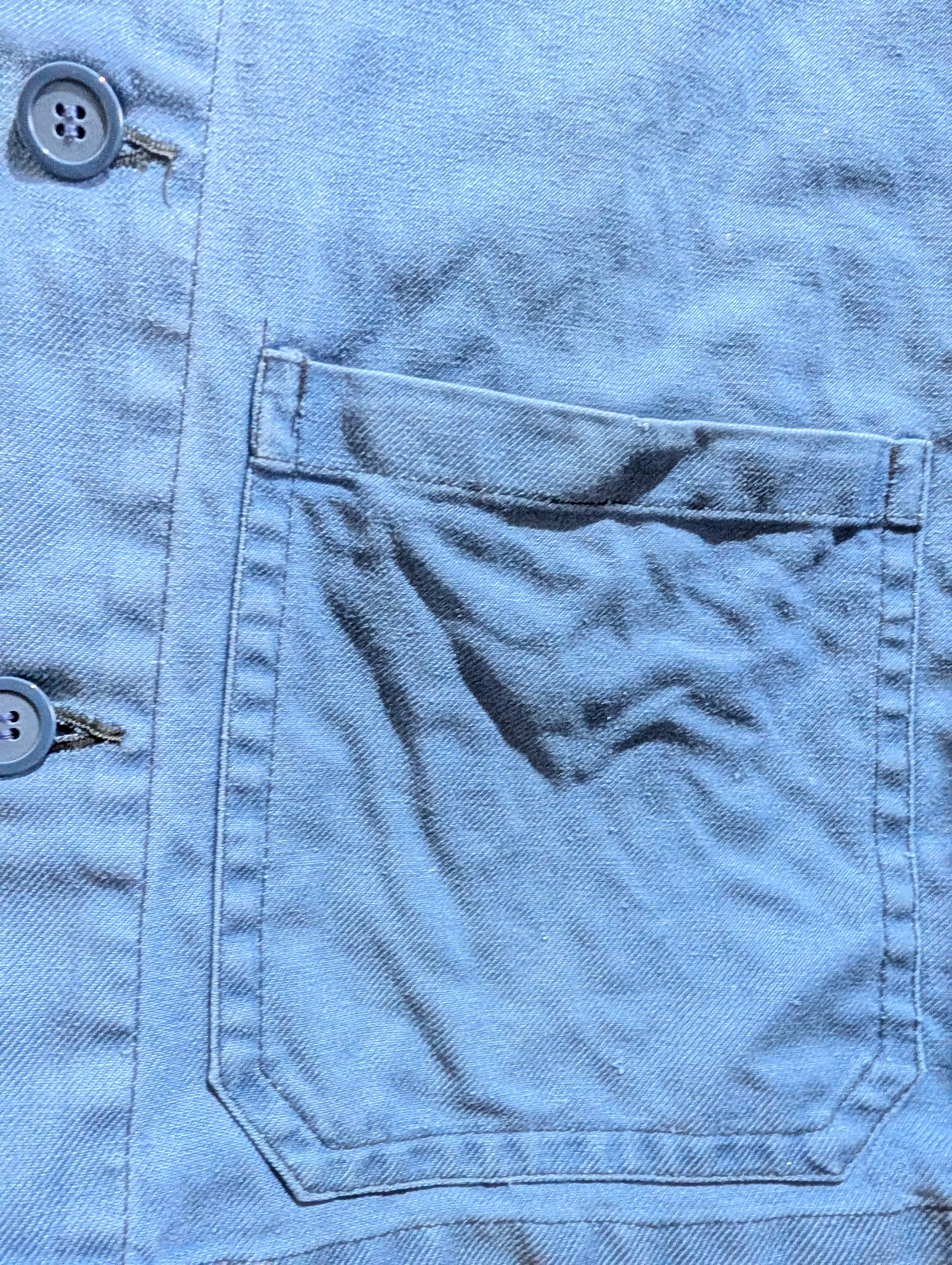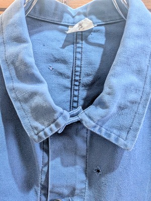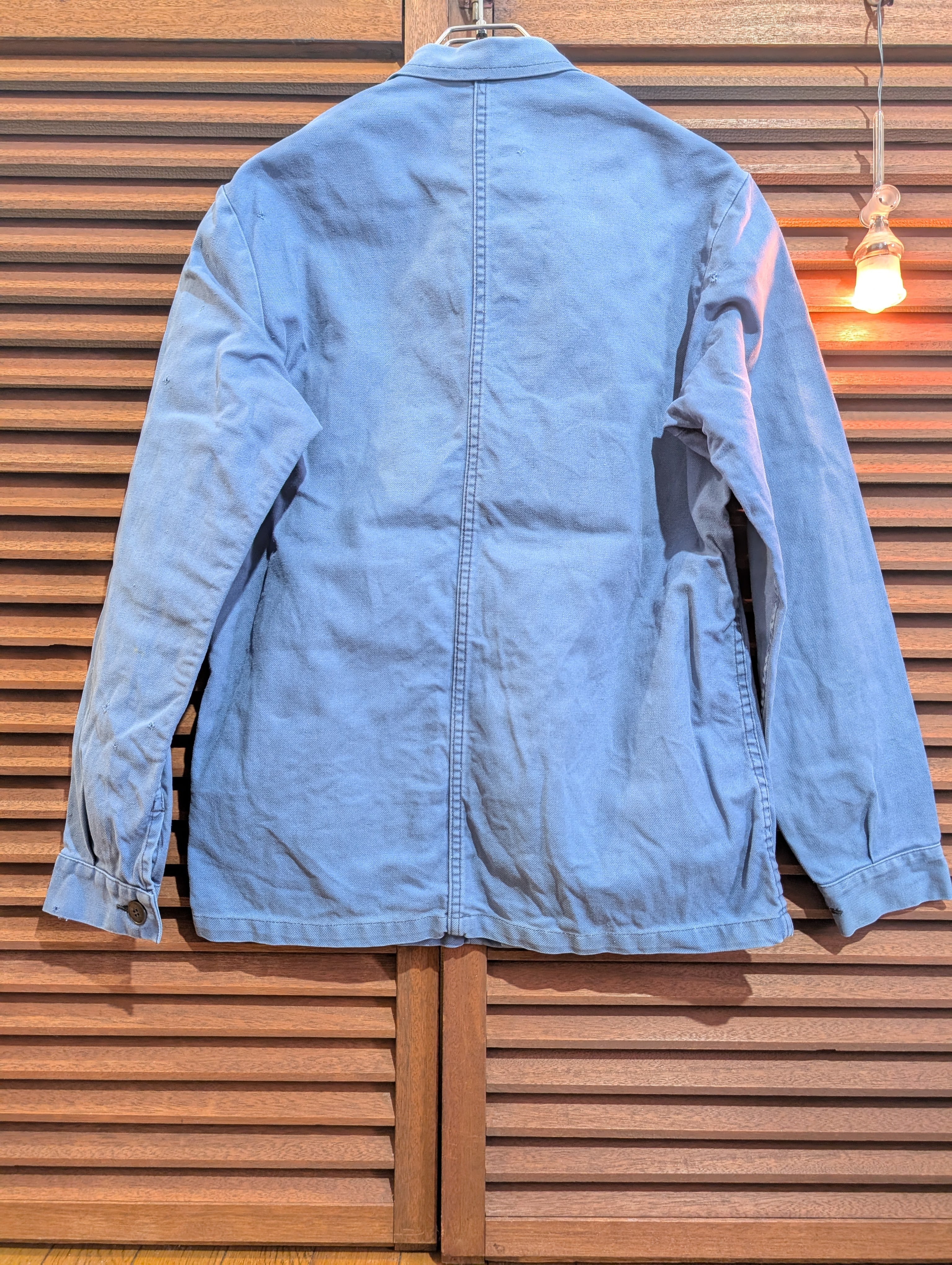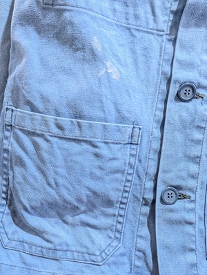 フェードしたライトブルーな色合いのワークジャケットは、インディゴブルーとはまた違う雰囲気を持っています。