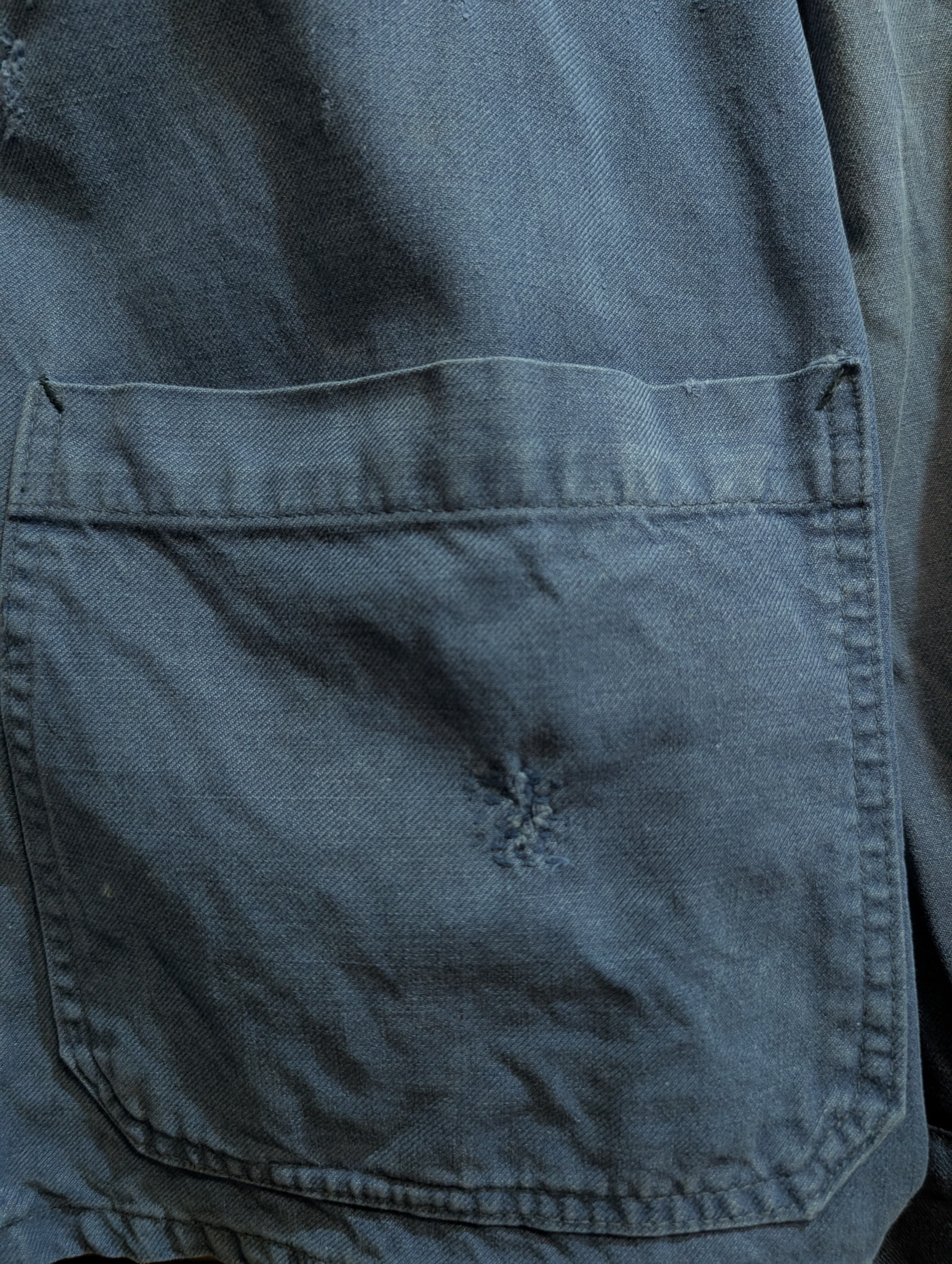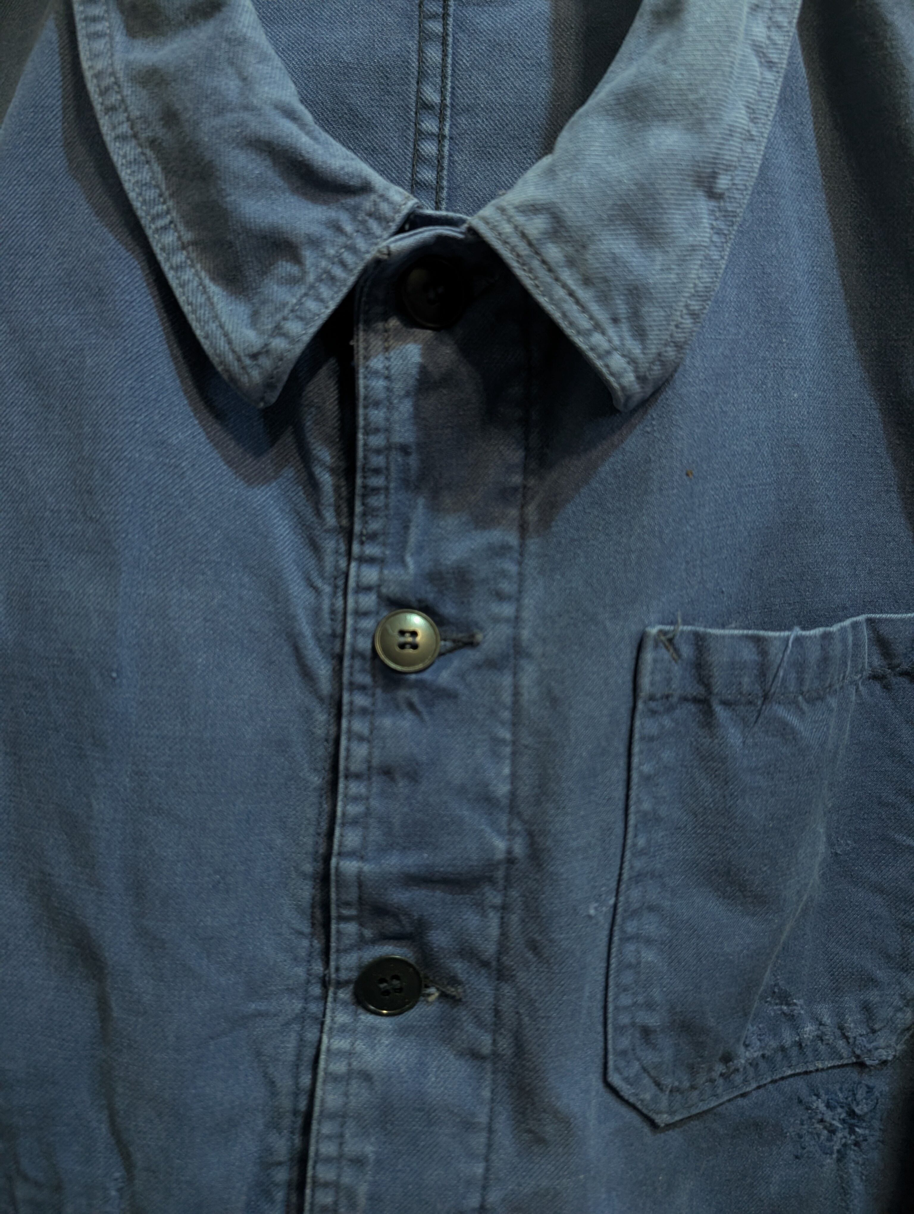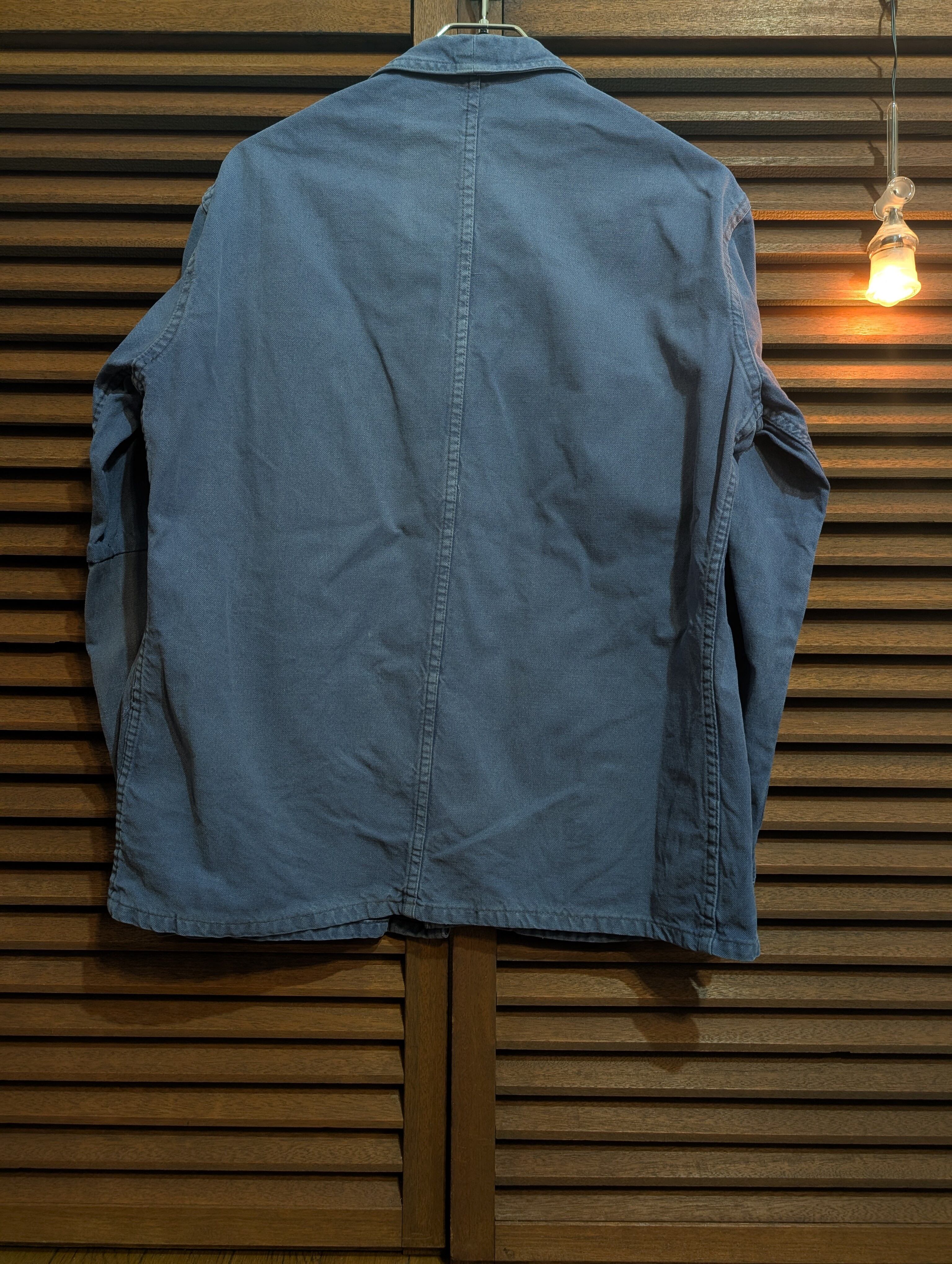 これぞフレンチワークジャケットというシルエットに、ヴィンテージ感を感じられる生地感と、ところどころのリペアとフェードの雰囲気がよく表れているアイテムとなっています。