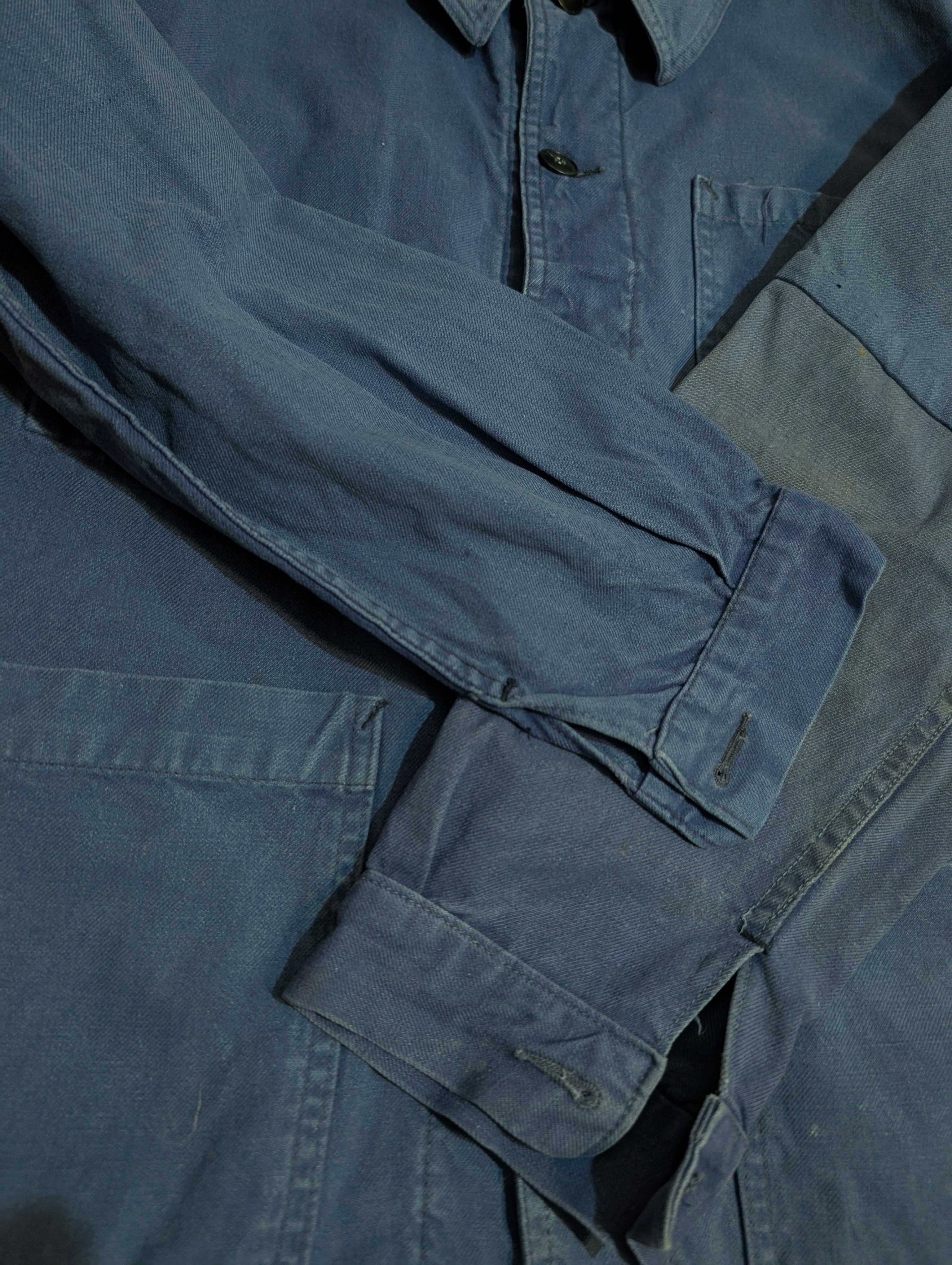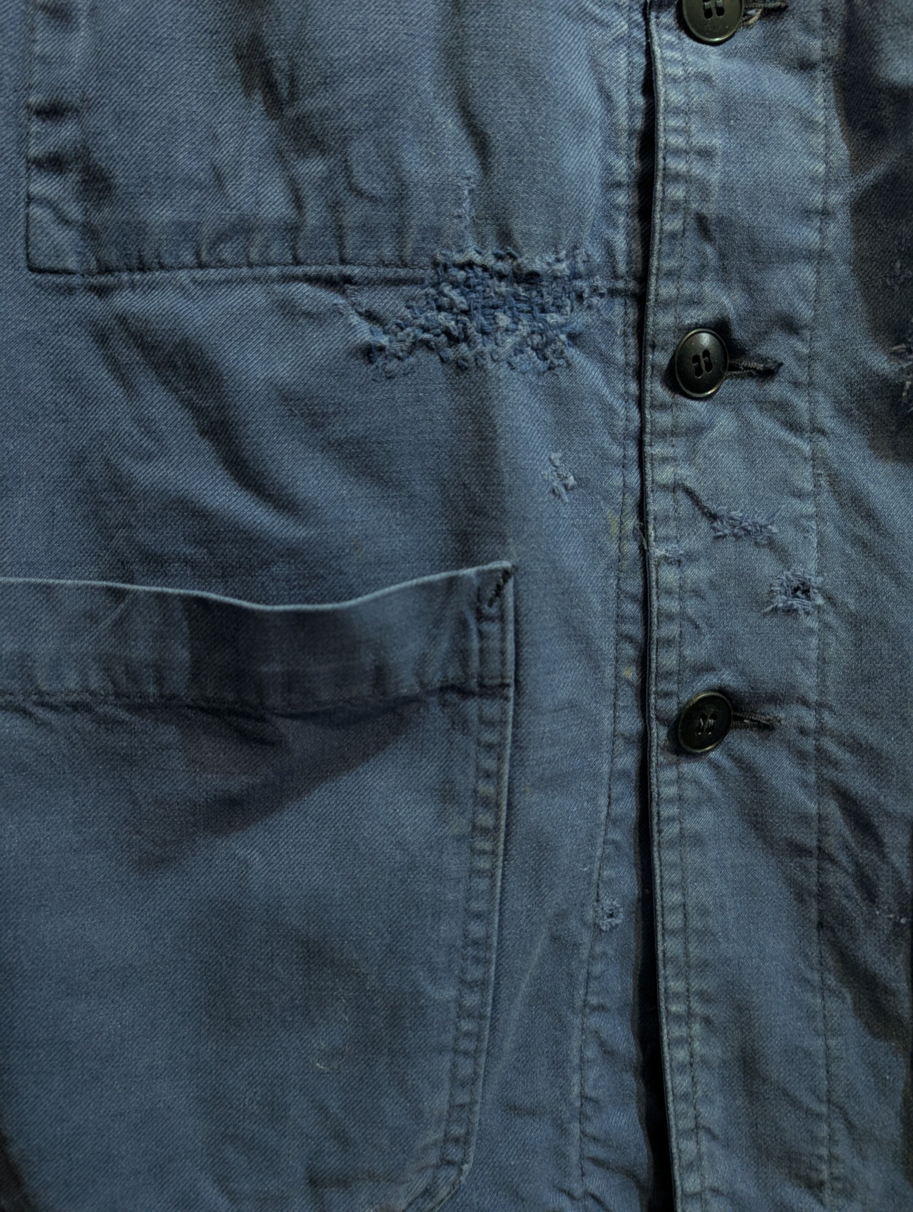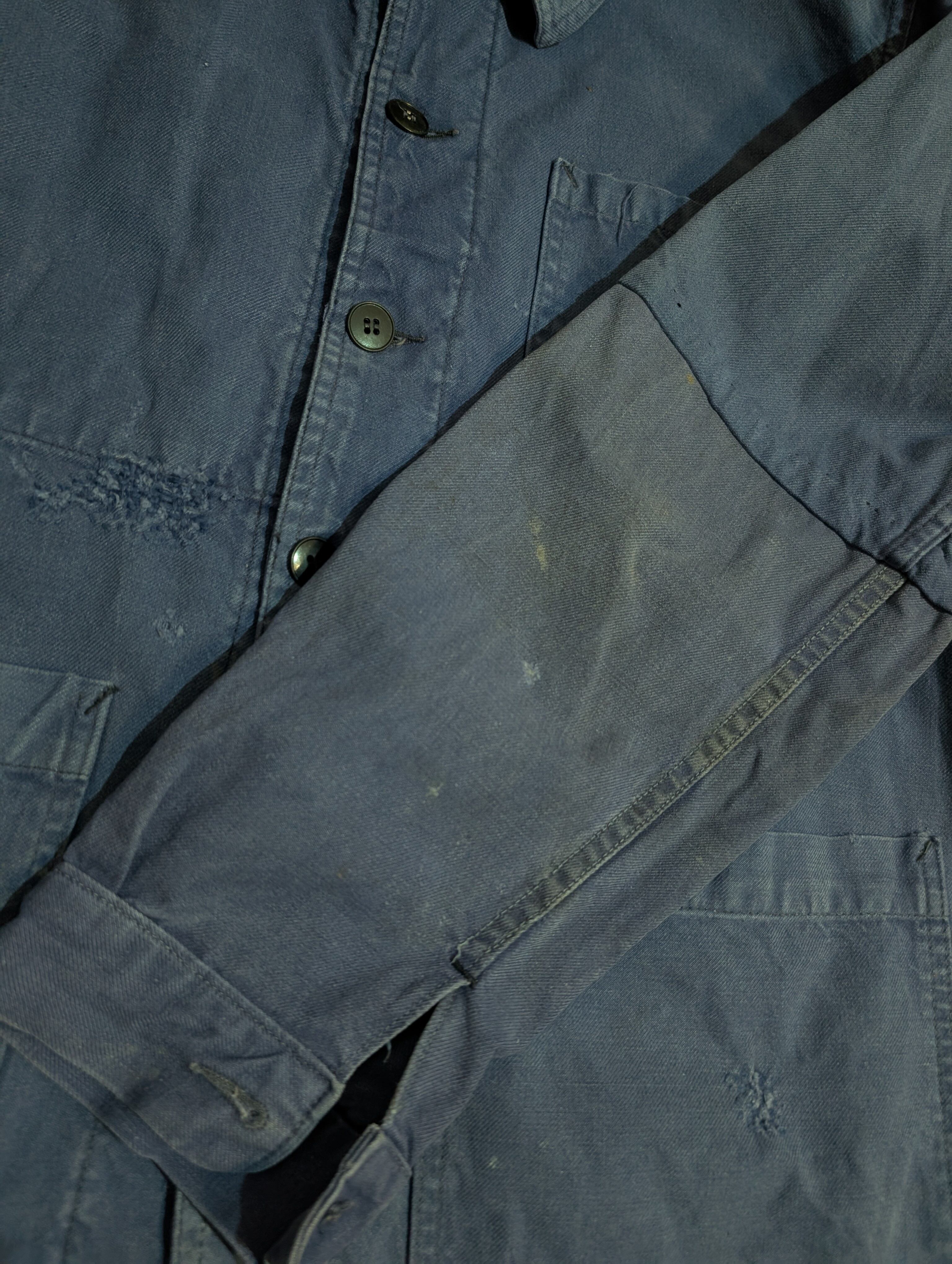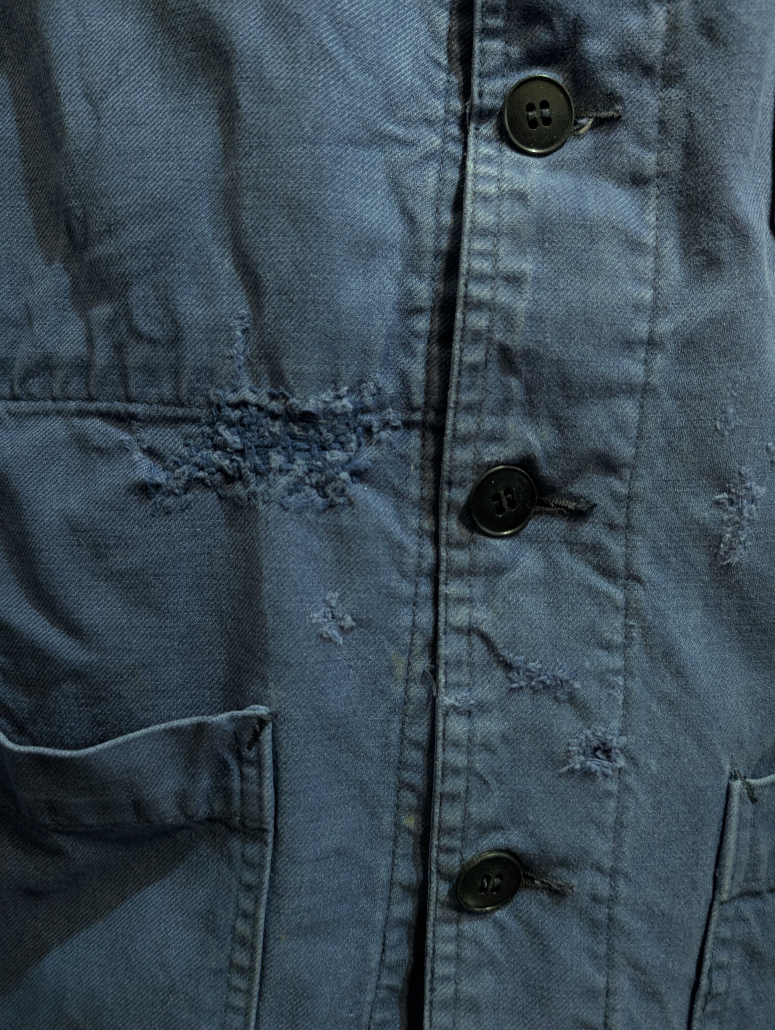 これぞフレンチワークジャケットというシルエットに、ヴィンテージ感を感じられる生地感と、ところどころのリペアとフェードの雰囲気がよく表れているアイテムとなっています。