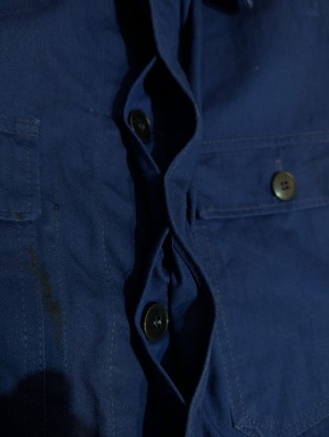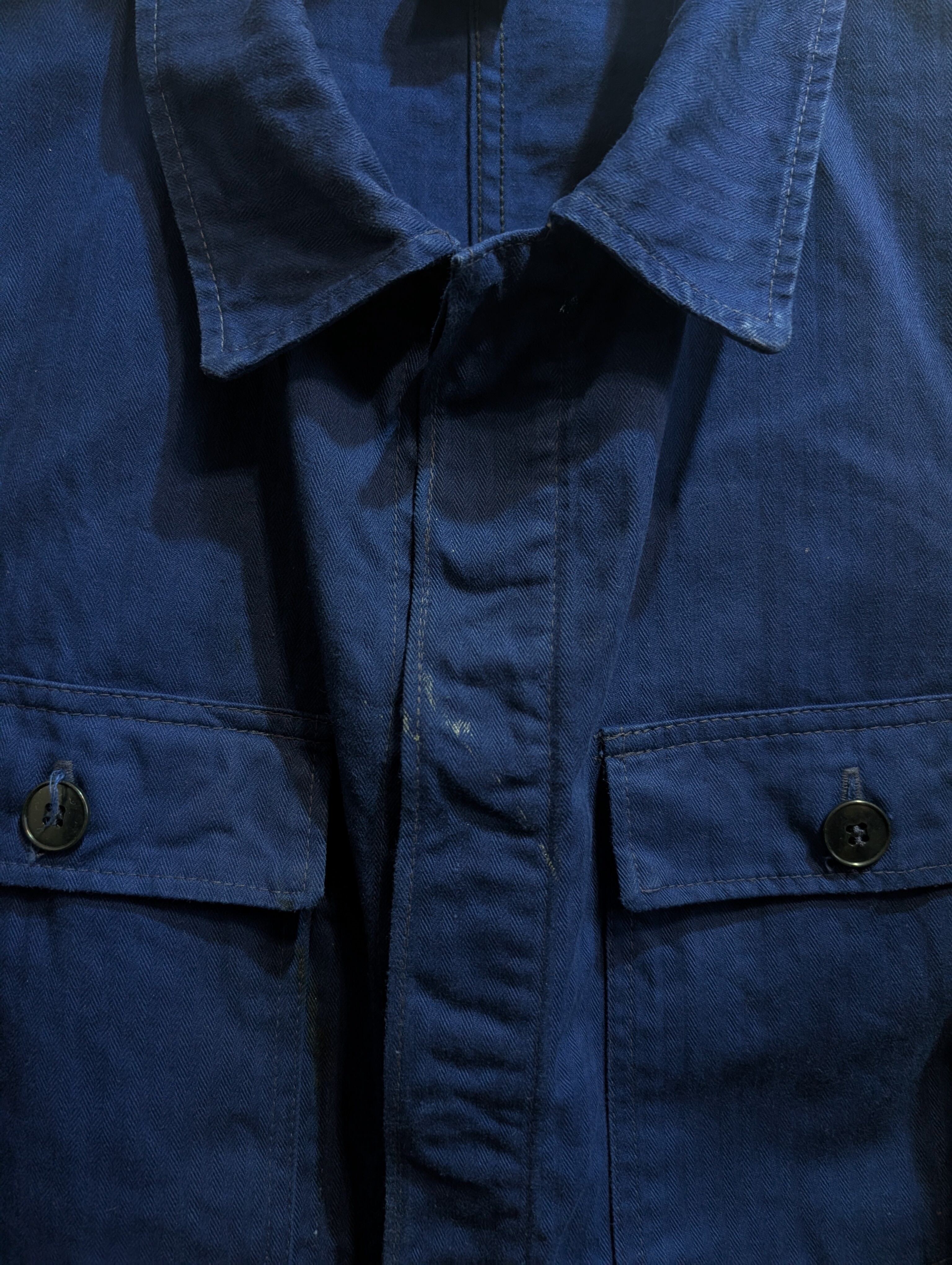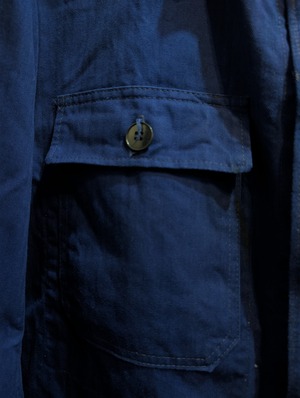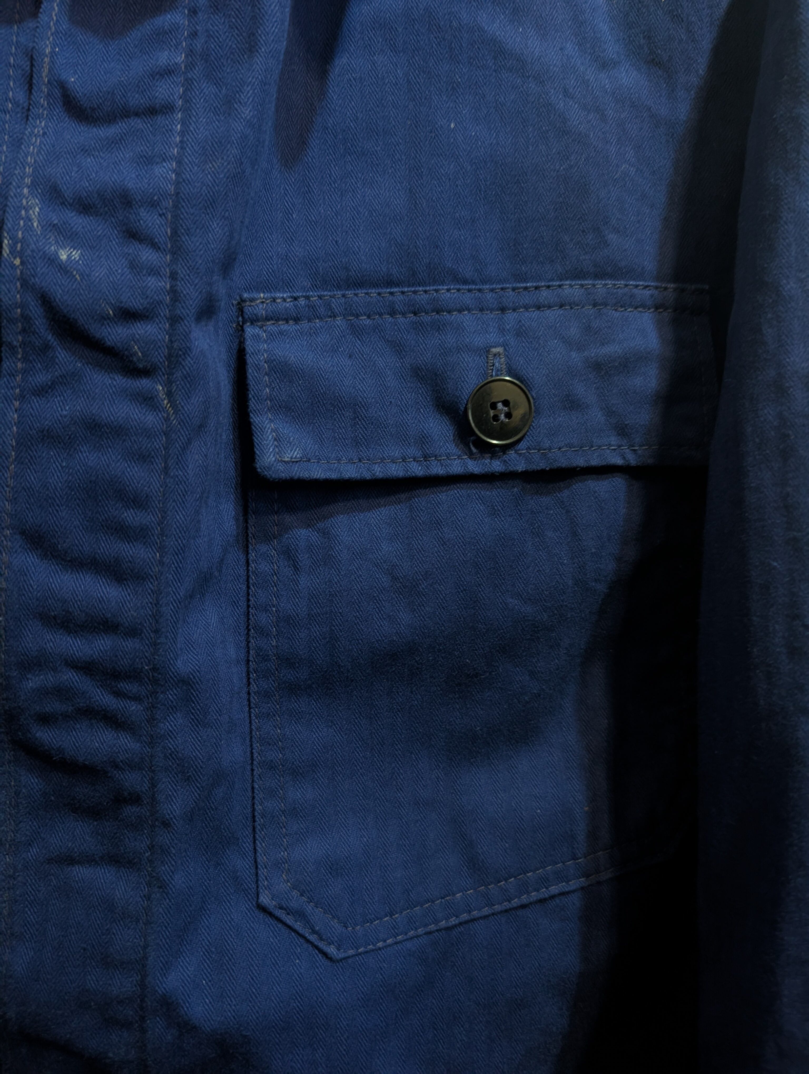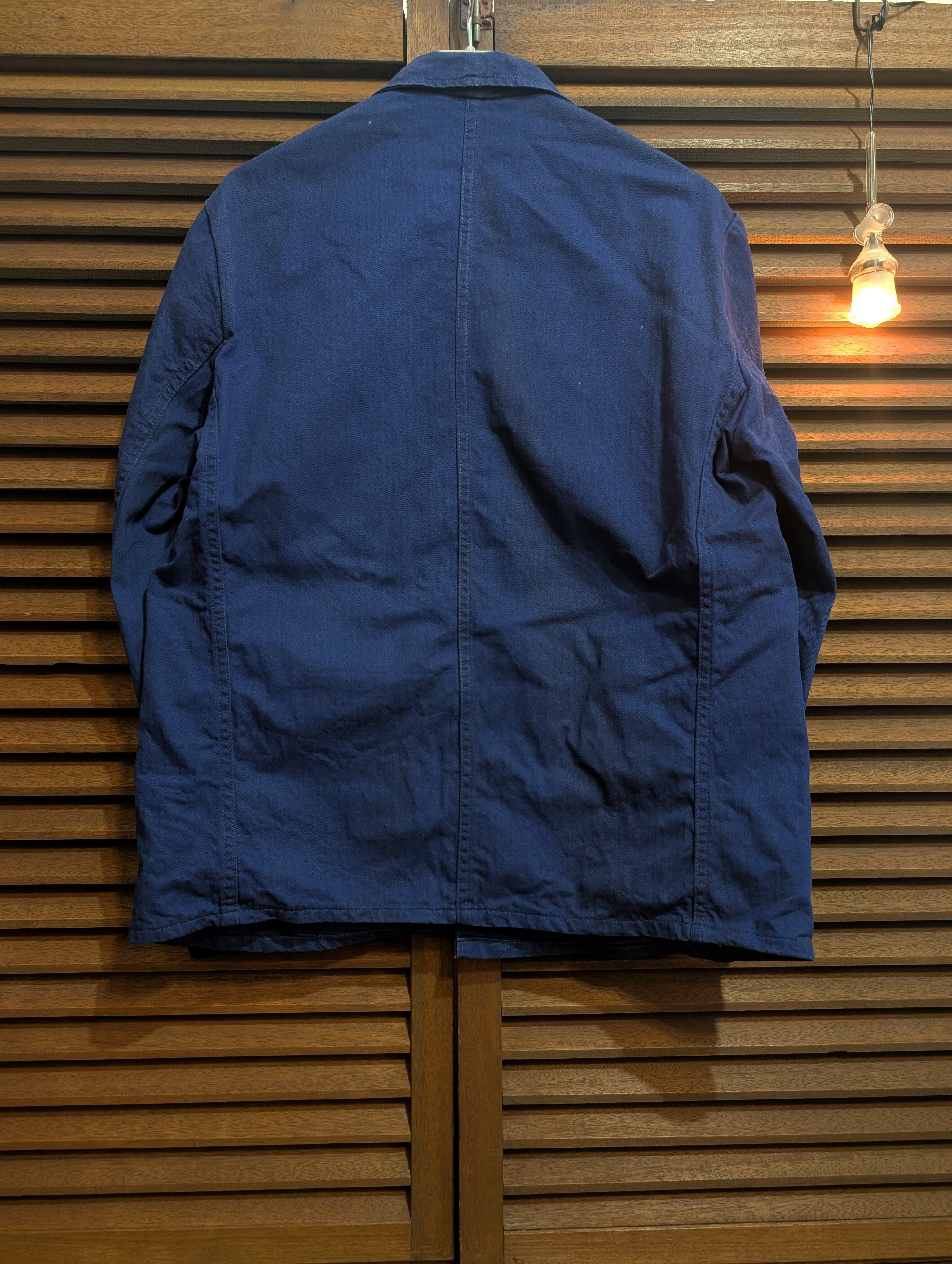 カラーはネイビーで、素材はコットンのヘリンボーンツイルとなっており、ニシンの骨に似たその織柄からも印象的なアイテムです。ヘリンボーンツイルは見た目だけでなく、織りの方向を左右交互に入れていくことで、耐久性なども上がるようになっています。機能性とデザイン性を兼ね備えたディテールを持ったアイテムとなっております。