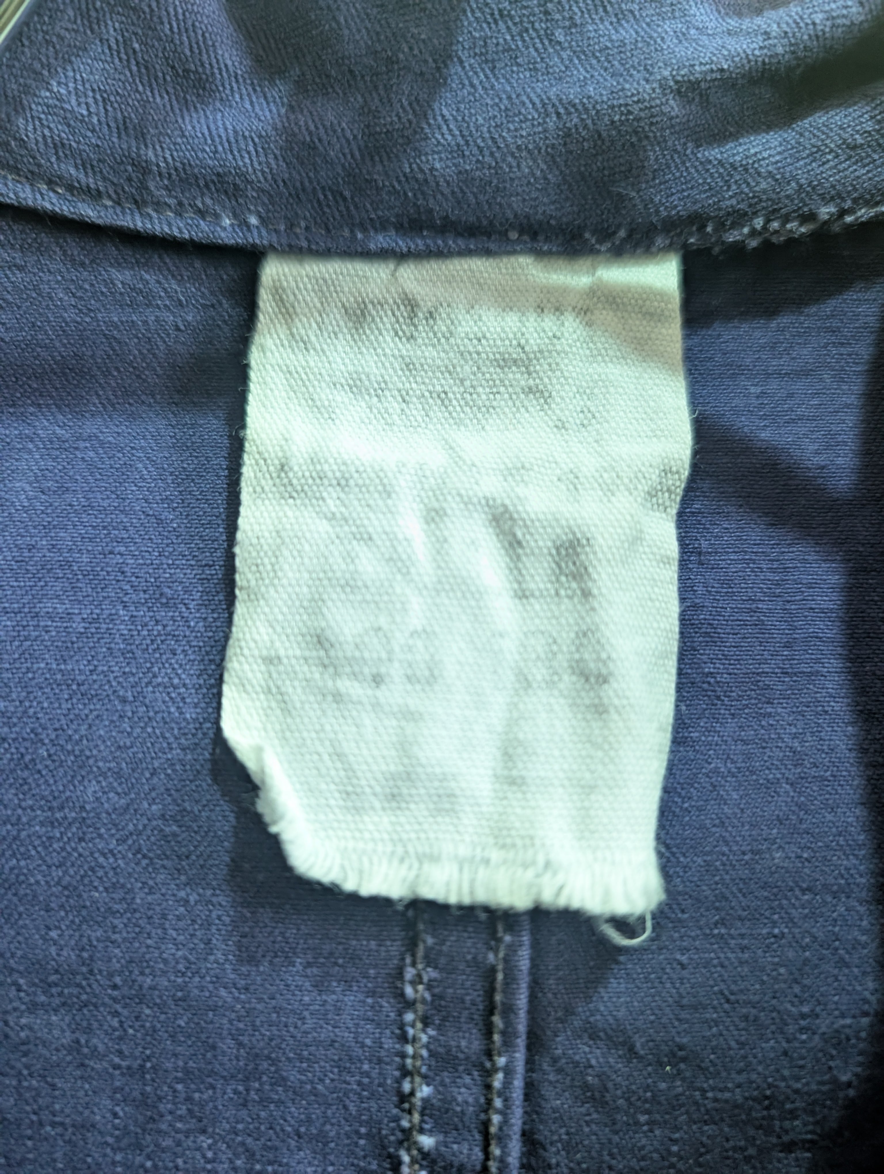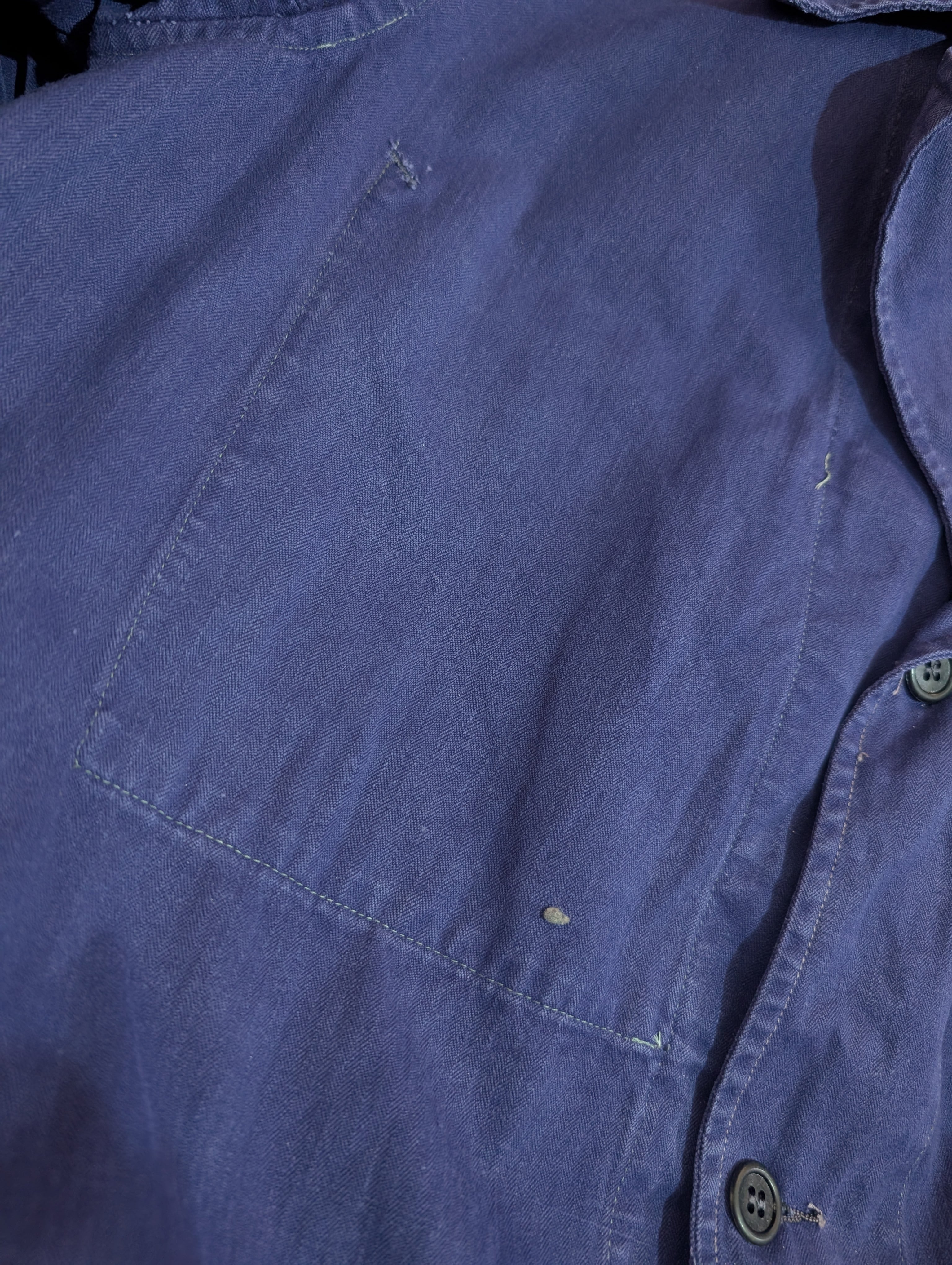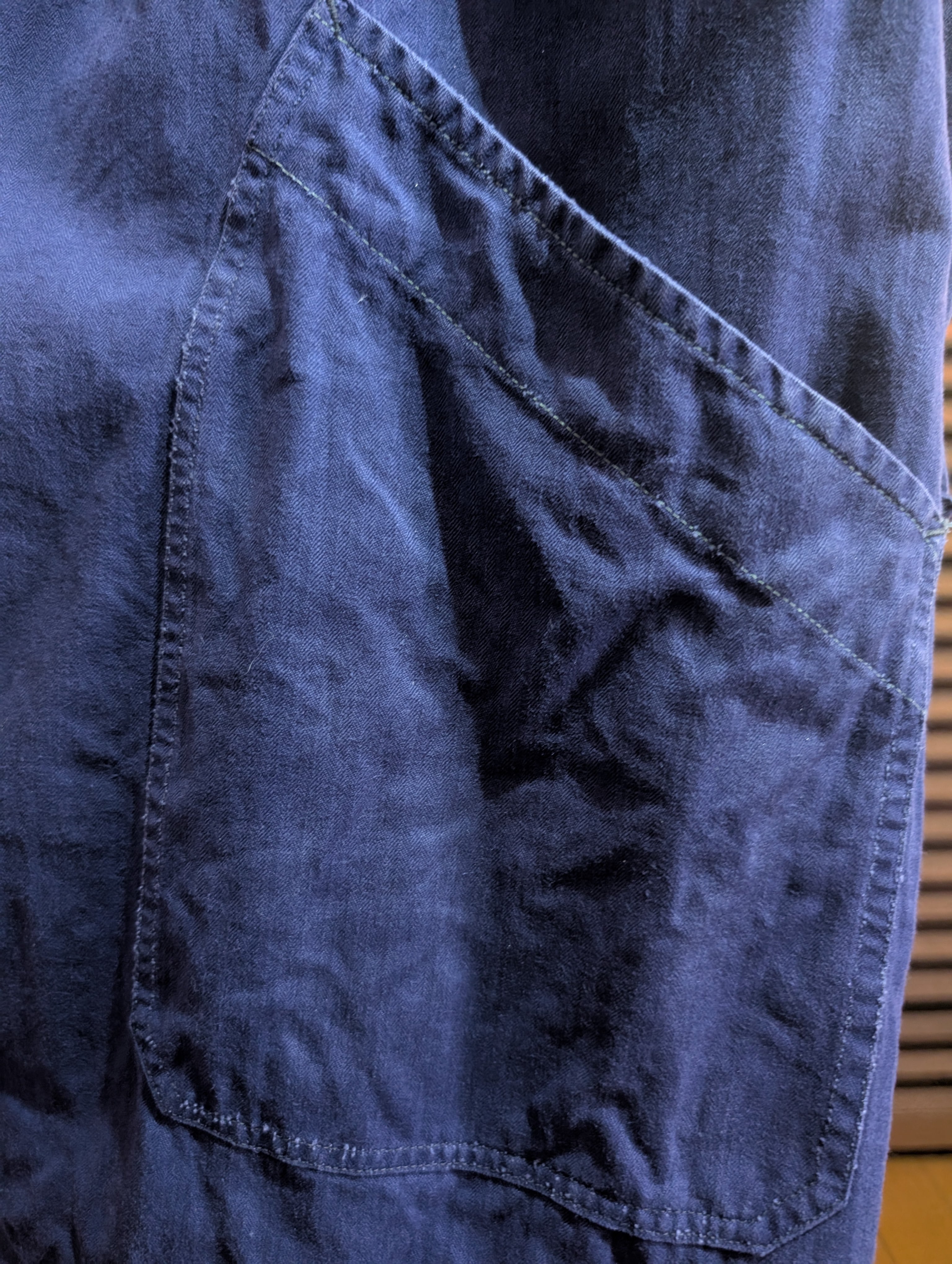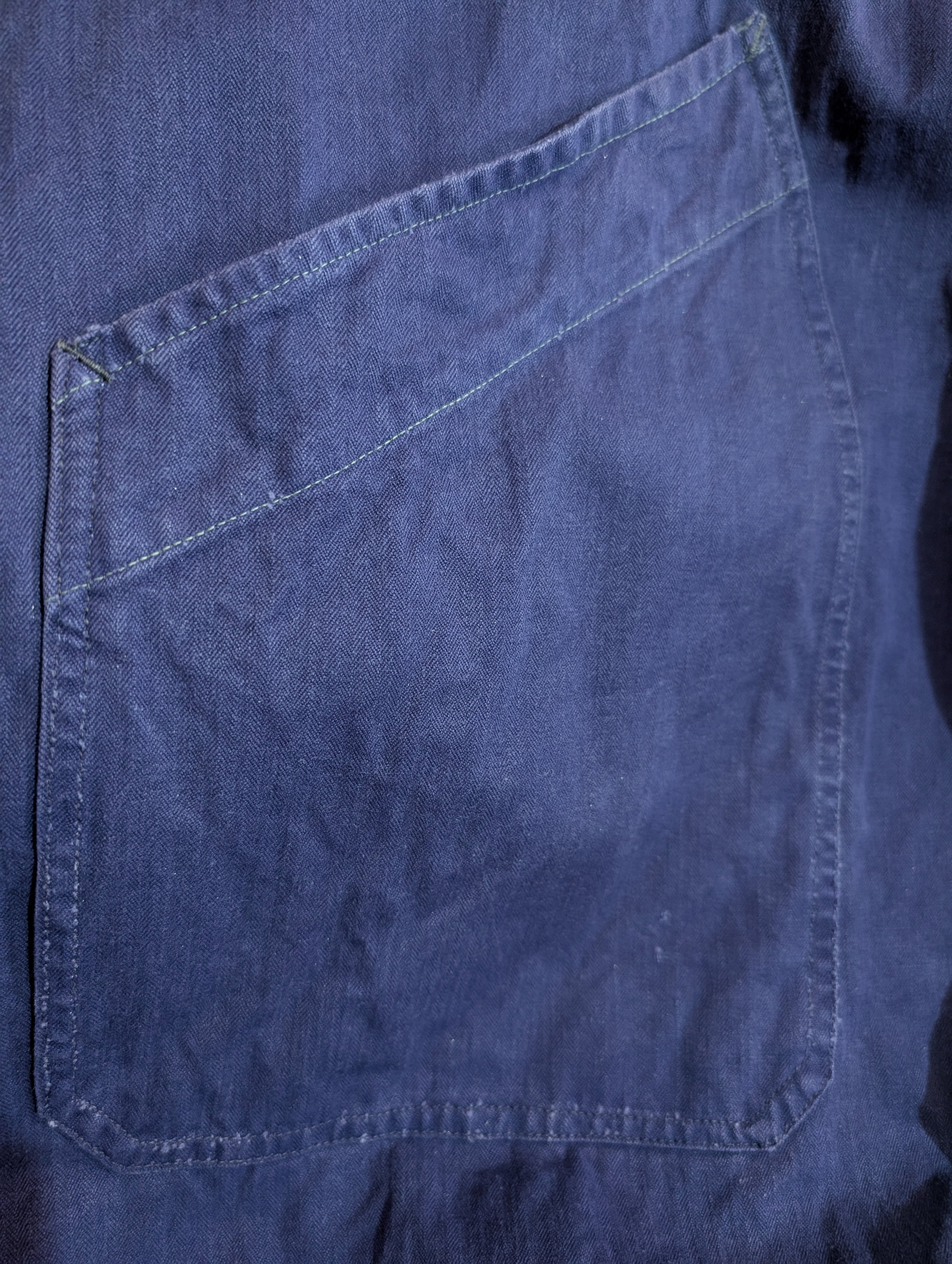 全体的にしっかりとした生地感で、カラーはネイビー、素材はヘリンボーンツイルとなっており、ニシンの骨に似たその織柄からも印象的なアイテムです。ヘリンボーンツイルは見た目だけでなく、織りの方向を左右交互に入れていくことで、耐久性なども上がるようになっています。機能性とデザイン性を兼ね備えたディテールを持ったアイテムとなっております。