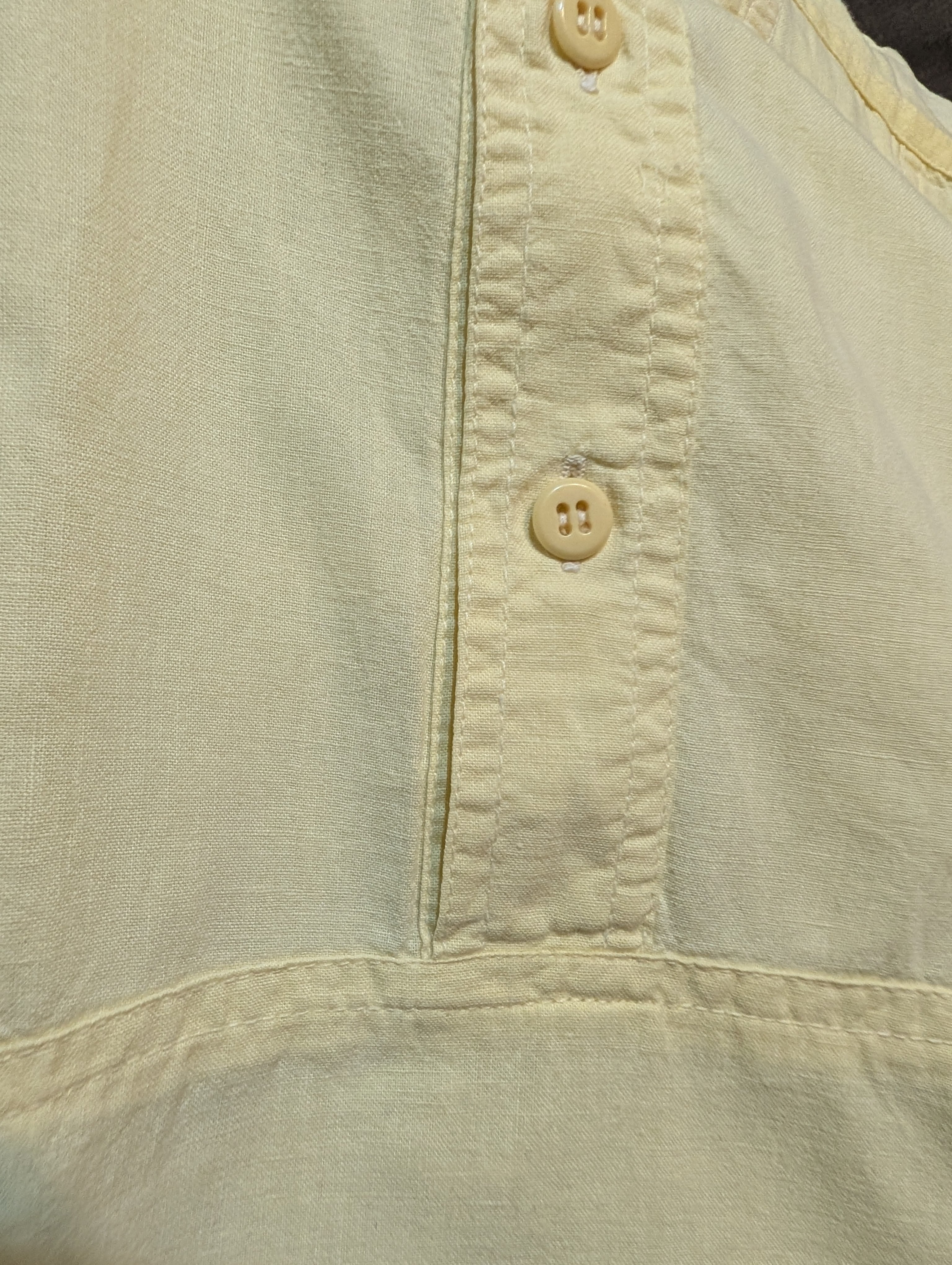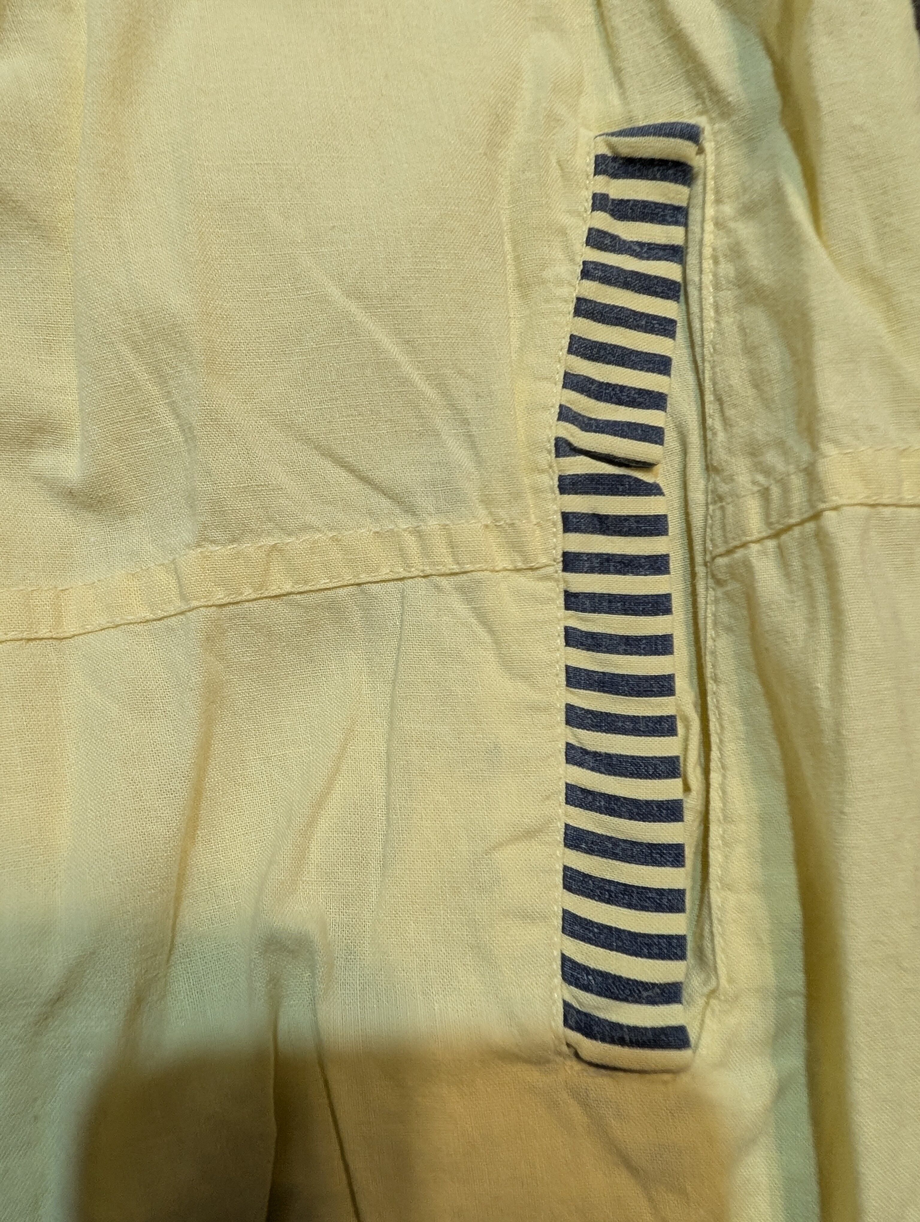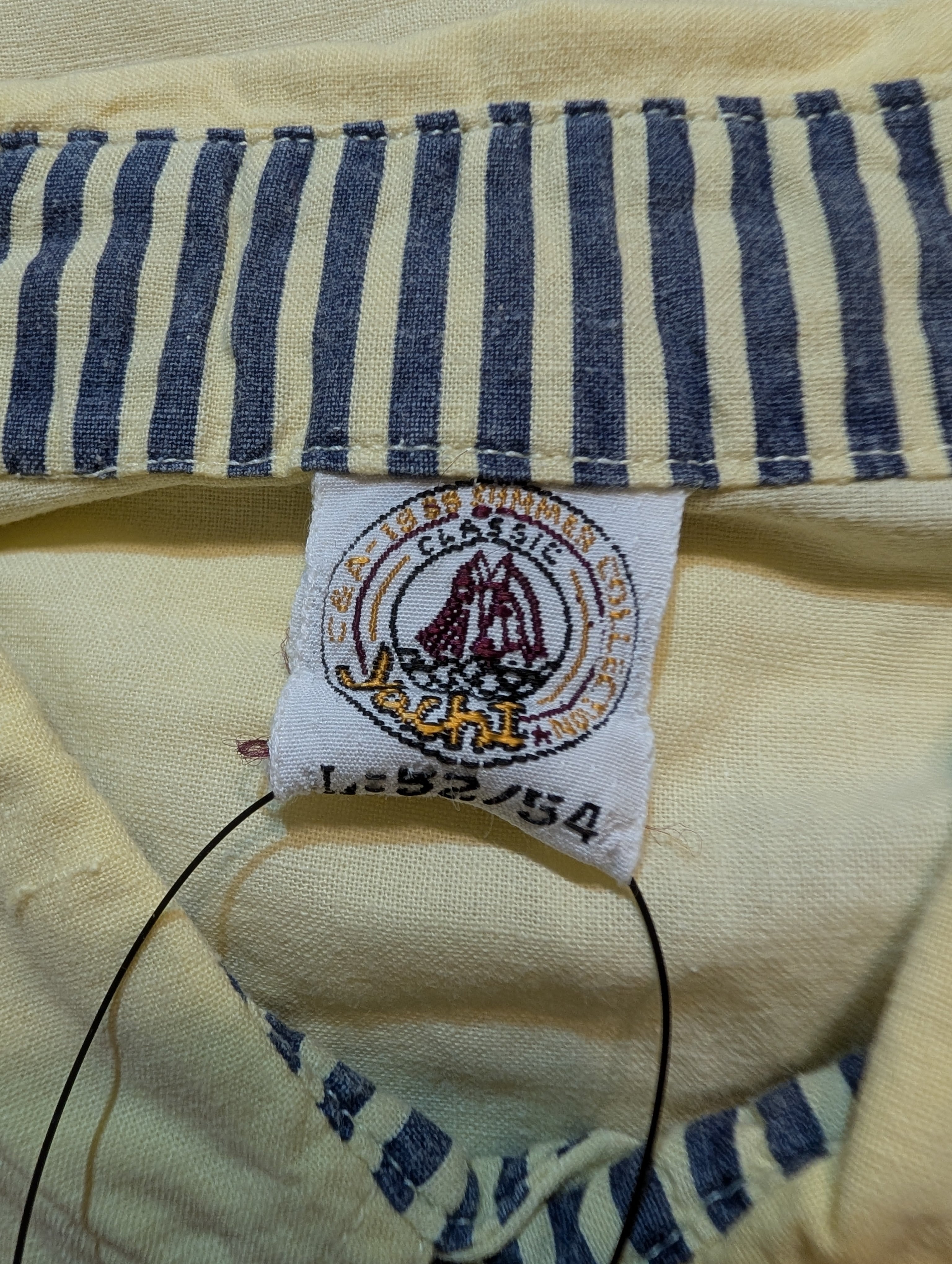 フェードした感じの薄いイエローにネイビーのストライプ柄が襟後と、ポケット口にあしらわれています。