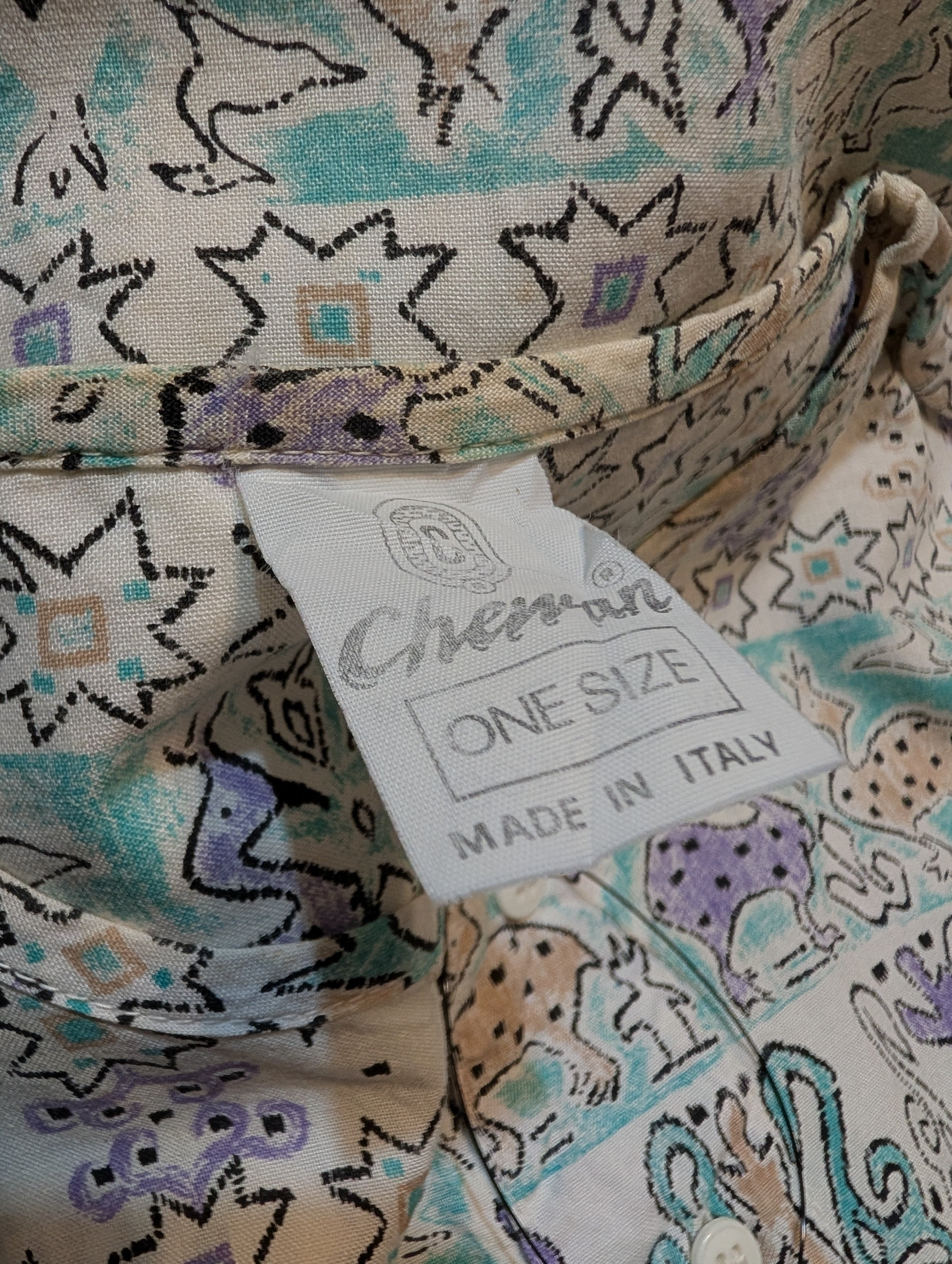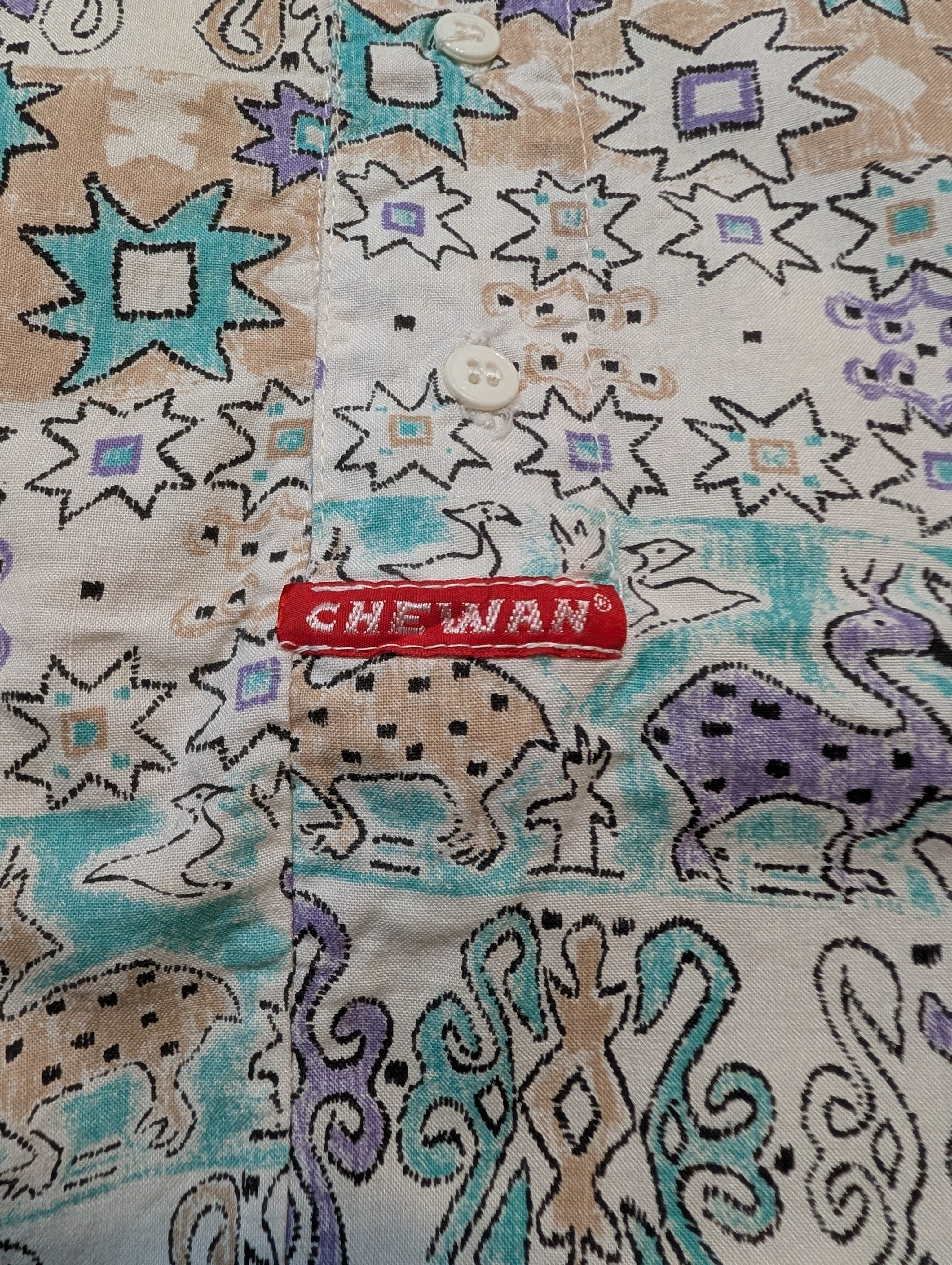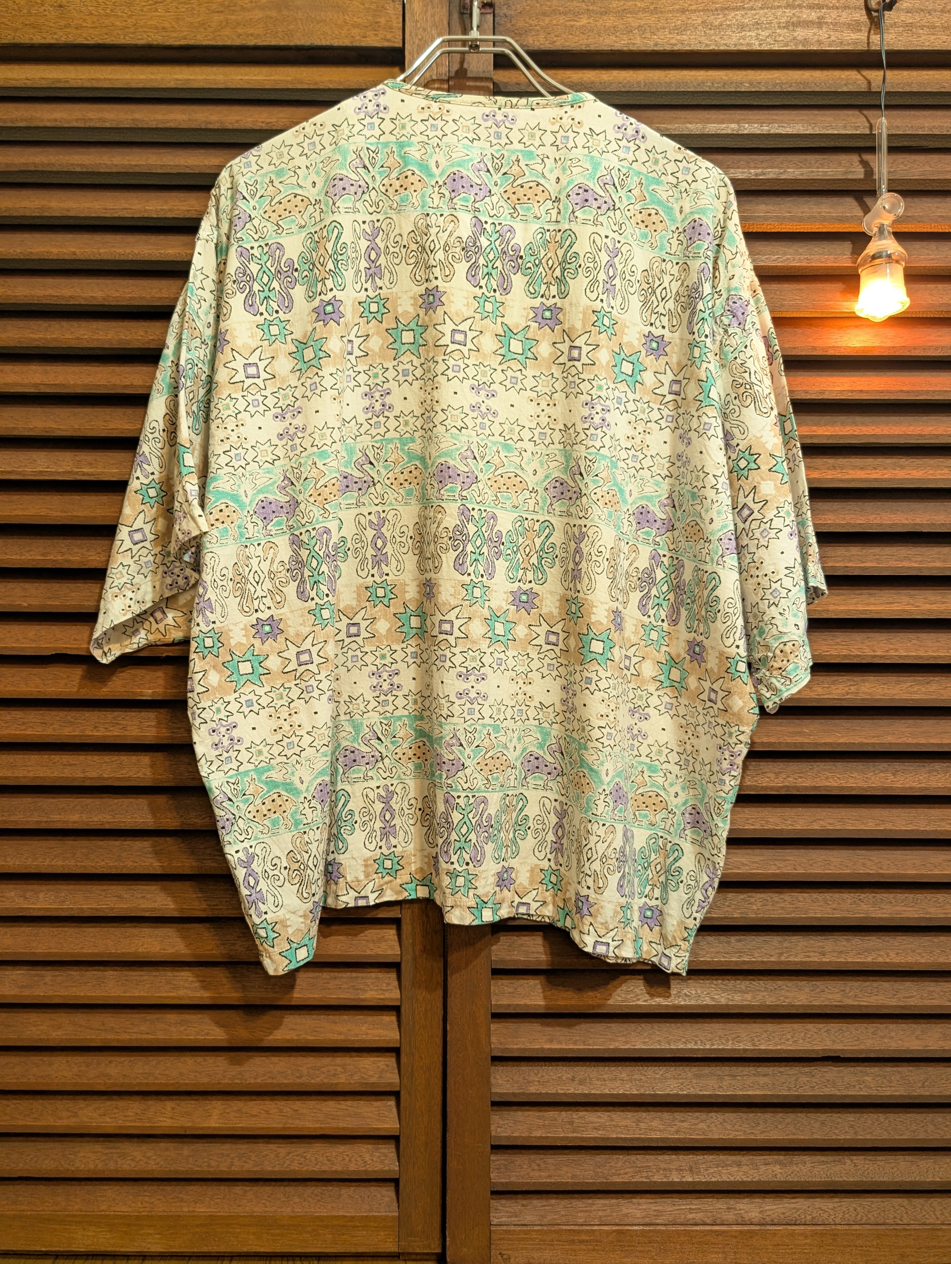 ノーカラーにフロントはボタン4つ、生地感はコットンなのでサラッとしております。動物と幾何学模様のパターンとなっており、淡いカラーリングとも相まってかわいい雰囲気です。