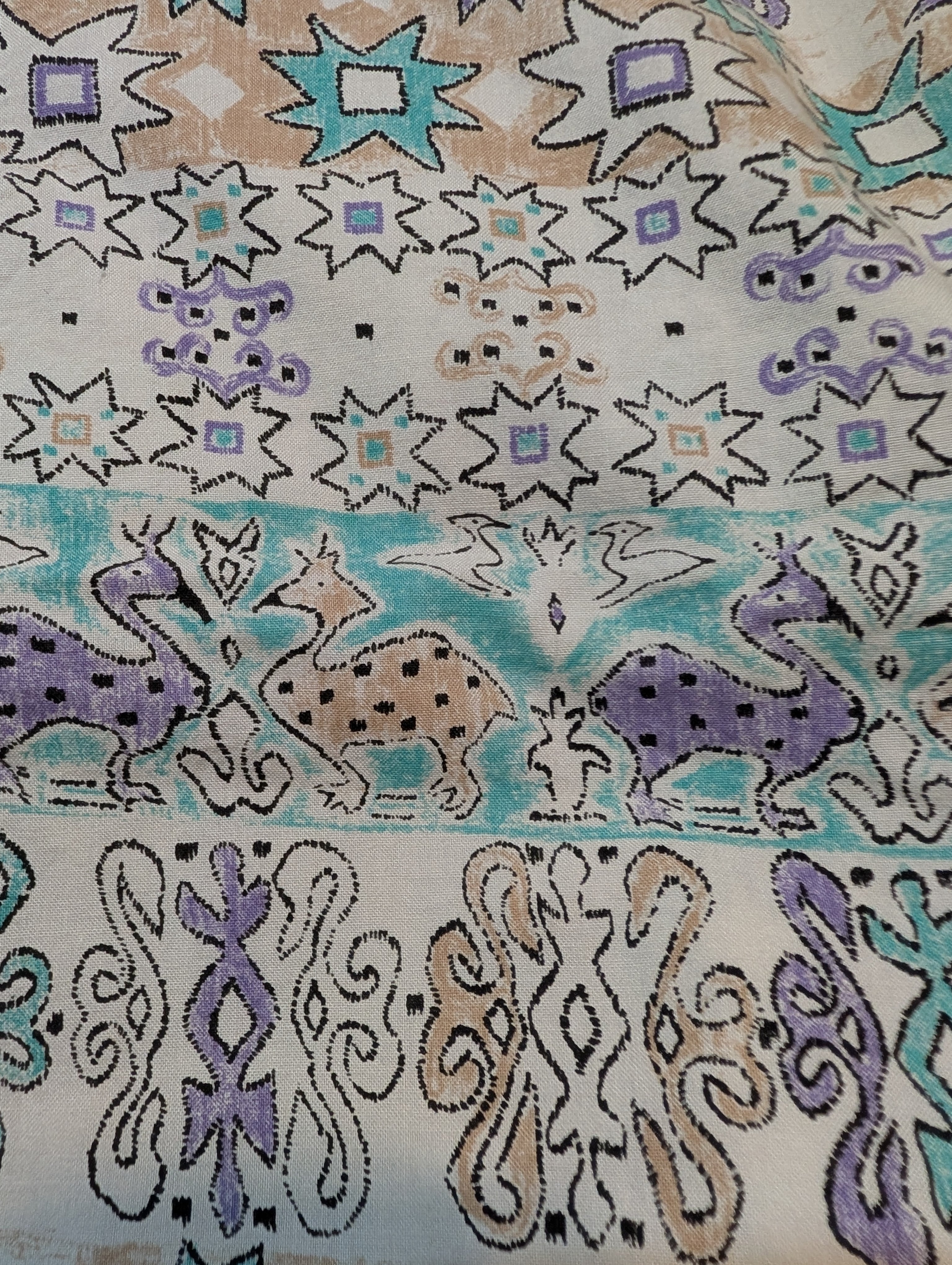 色味はオフホワイトベースに、パステル系のエメラルドグリーンとパープルとブラウンでパターンが彩られています。