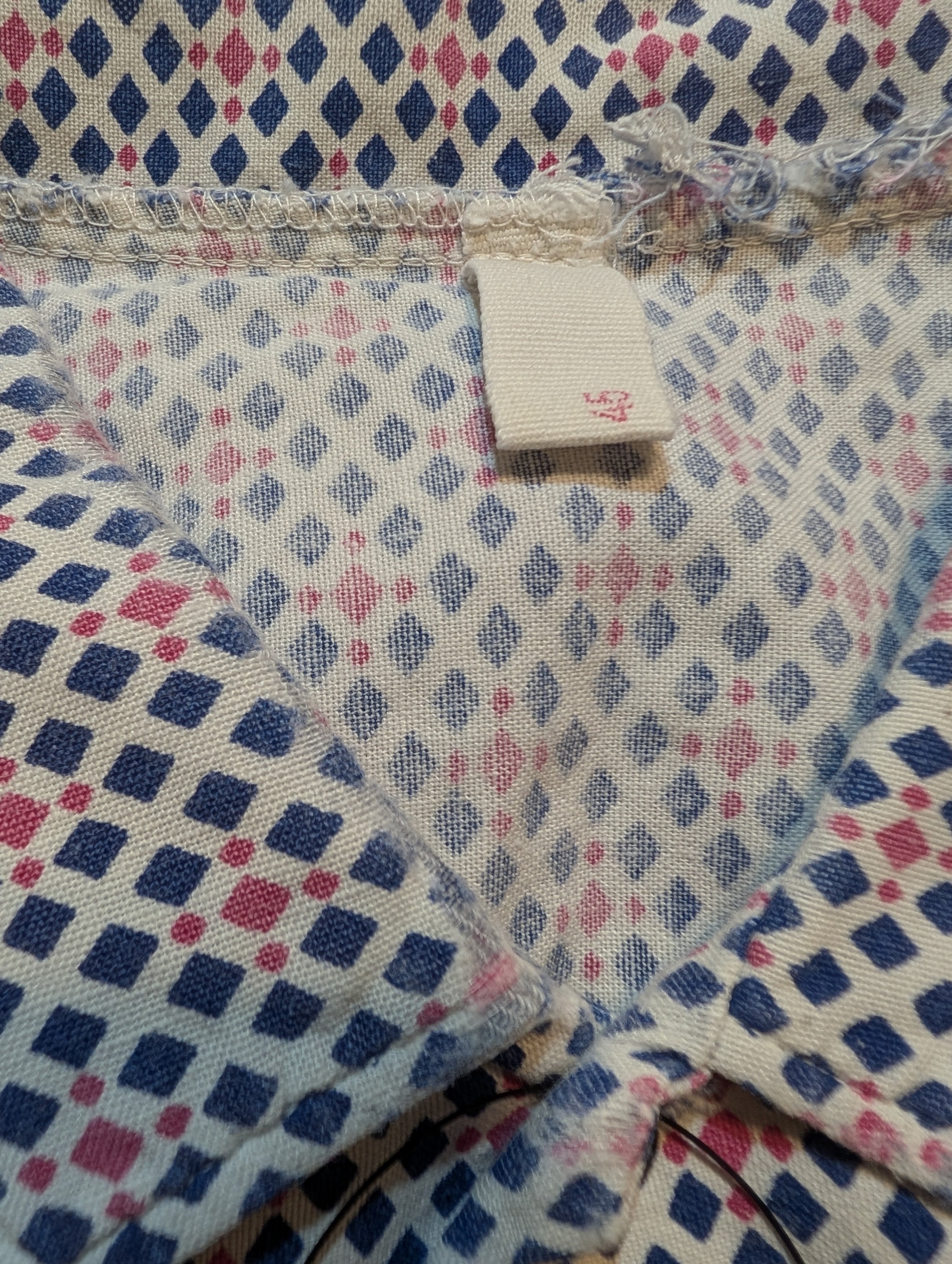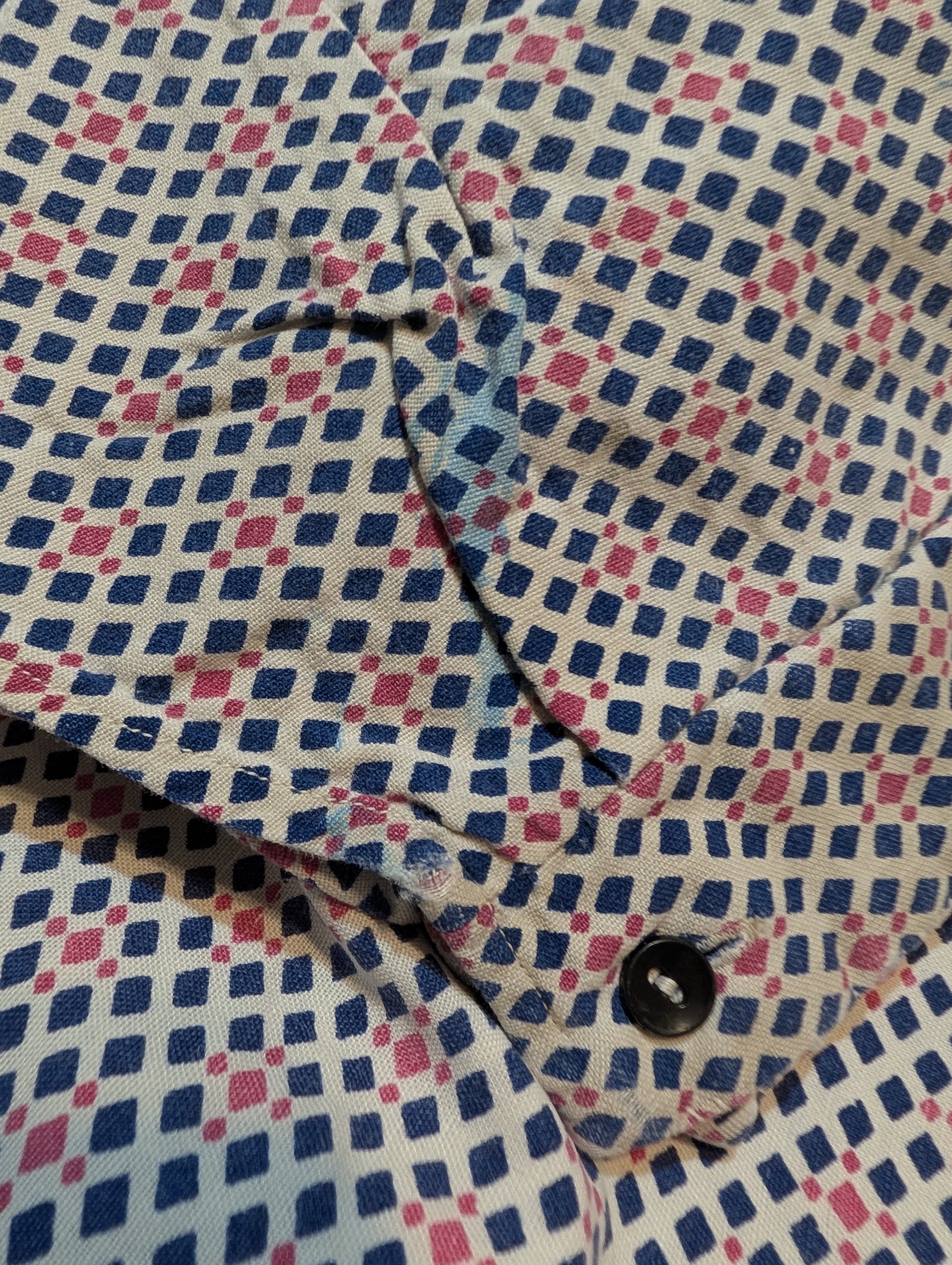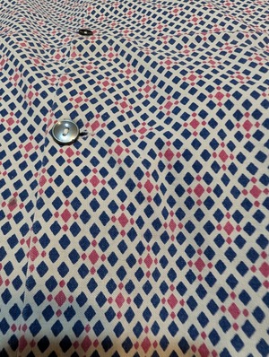 濃いめのネイビーとレッドの幾何学模様のパターンデザインとなっております。生地はコットン生地です。