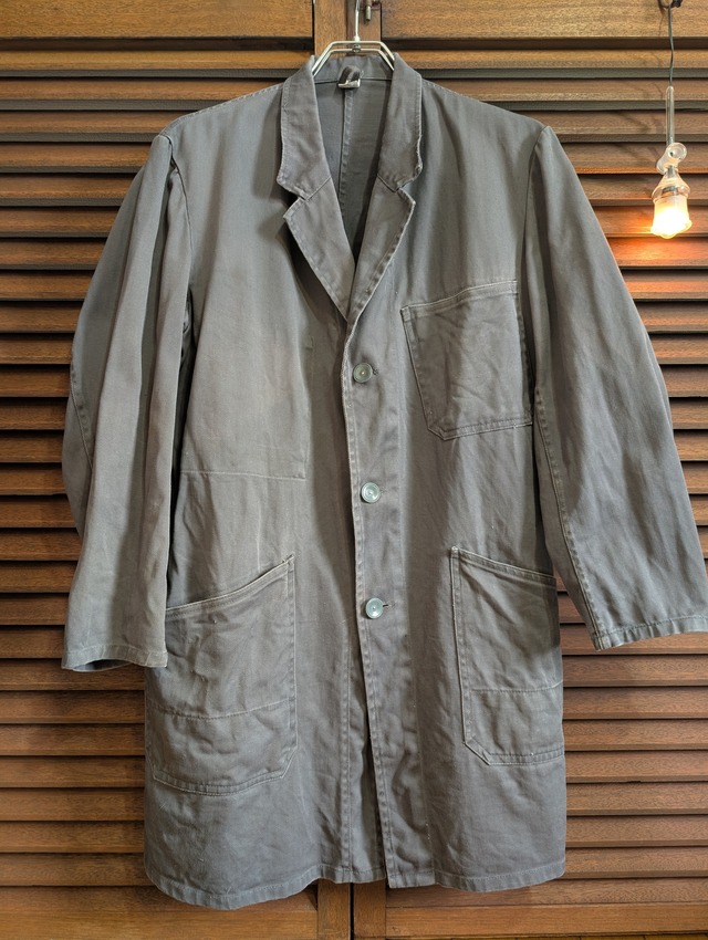 フレンチワークの代表的なアイテムのアトリエコートで、フェードしたブラックシャンブレー素材が魅力的かつ、ヴィンテージの風合いをお楽しみいただけます。